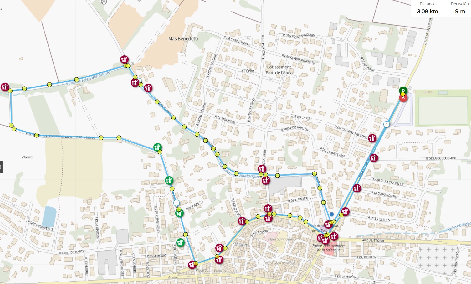 Une boucle de 10 km autour du village de Villelongue de la Salanque est proposée avec le départ et l'arrivée aux portes du Stade Joseph Raynal