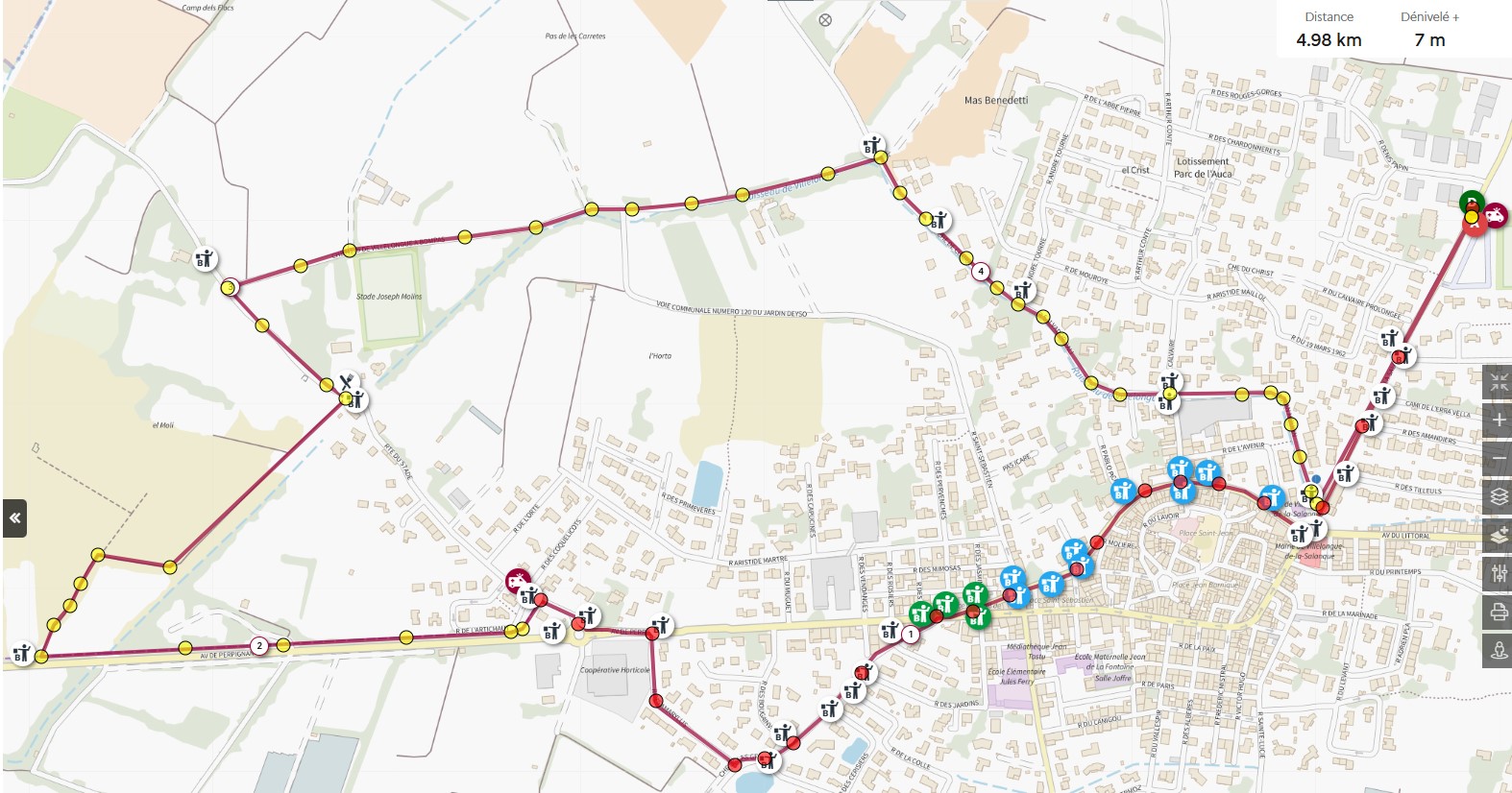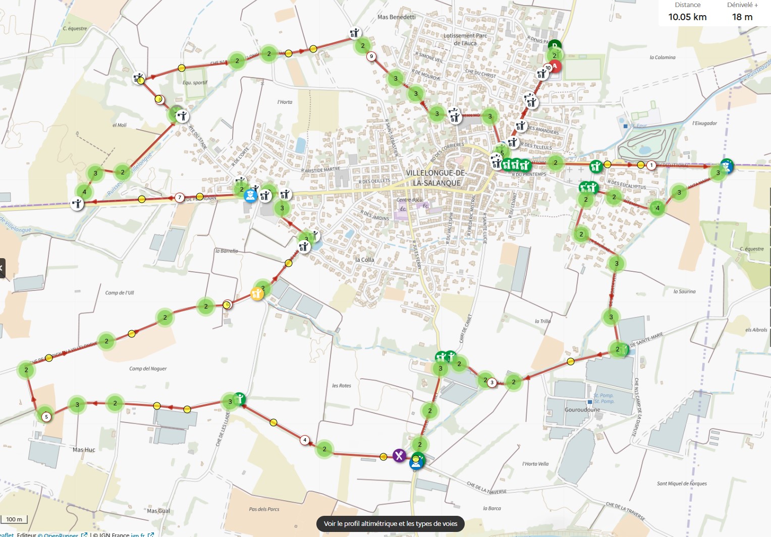 Une boucle de 10 km autour du village de Villelongue de la Salanque est proposée avec le départ et l'arrivée aux portes du Stade Joseph Raynal